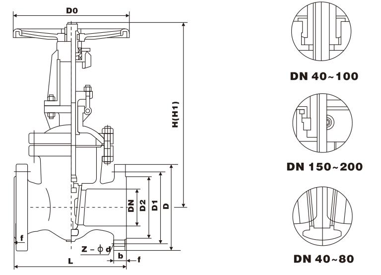 | inch | DN | L | D | D1 | D2 | b | z-Φd | H | D0 | |